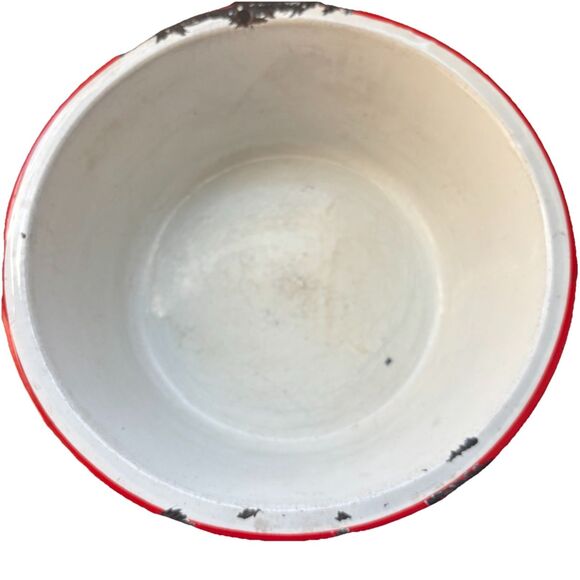 This is a beautiful piece of vintage enamelware (also known as graniteware) that makes a fantastic accent for farmhouse, rustic, industrial, or cottage chic decor. The bright white porcelain enamel with the classic red rolled rim is a highly popular color combination.