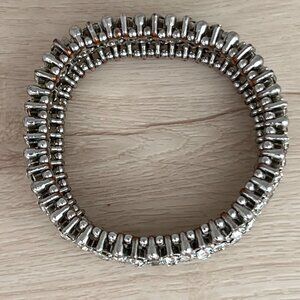 This vintage bracelet showcases stunning white rhinestones set in silver-tone metal. In great condition, no missing or discolored stones. The stretch design ensures a comfortable fit for any wrist size. Measuring 1 inch in width, this bracelet is the perfect statement piece and really catches the light, giving off a lot of sparkle.