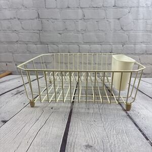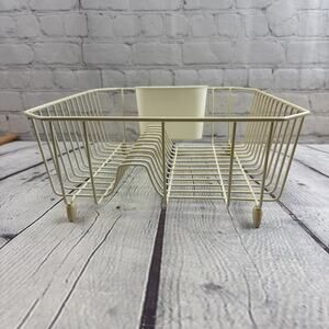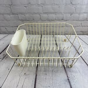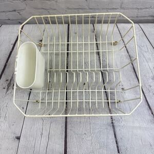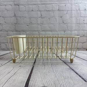 The Vintage White Rubbermaid Dish Drainer Drying Rack is a medium-sized, coated wire rack perfect for drying dishes in the kitchen. With a classic white/off-white color and made with a combination of metal and rubber materials, this rack is both durable and stylish. The item stands at 5.5 inches tall and has dimensions of 13 inches in length and 14 inches in width. A reliable and practical addition to any kitchen storage and organization system.