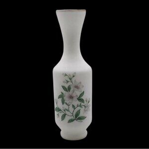 Vintage White Satin Glass Vase With Floral Design & Gold Trim