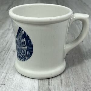 Vintage White Shaving Mug With Busy Ship Dock Scene In Blue