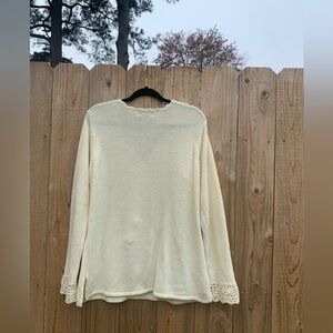 White stag cream sweater with Pom poms size large 12/14. Preowned good condition, has tiny stain that isn’t noticeable (. see photo), otherwise great! This is Super cozy and has cutout detailing. 100% acrylic. 24 in pit to pit, 30 in top to bottom. Ships in 1-2 days 🦄