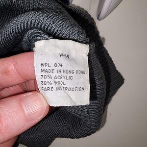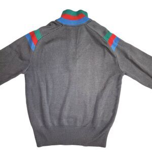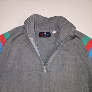 Vintage White Stag Grey Wool Blend Quarter Zip Pullover Sweater Size L. This vintage men's sweater is made from a soft 70% acrylic and 30% wool blend, has a quarter zipper mock neck, ribbed hem and cuffs, green, red & blue stripes, long sleeves. Great vintage condition with a few minor areas of piling.