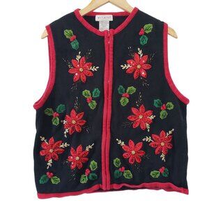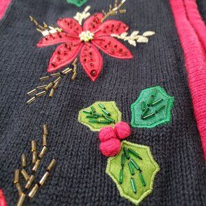 This timeless 90s sweater vest by White Stag features exquisite poinsettia embroidery and beading. The festive design and rich black and red hues evoke cherished holiday memories.