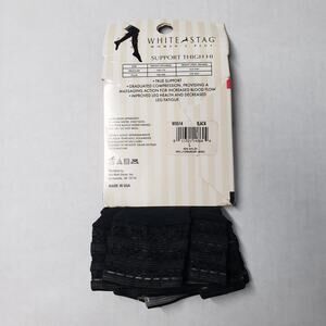 White Stag Women's Plus Support Thigh Highs. Includes one pair of black graduated compression stockings with true support. Features elegant lace tops with silicone lining to keep them securely in place. Vintage from the 2000s.