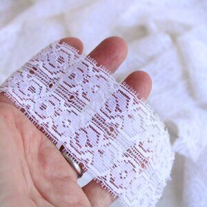 Lovely vintage stretch lace trim. Snow white, 1 & 7/8" ( nearly 2 inches) wide. Listing is for one piece of three yards plus 20". Orders for more will be shipped as continuous yardage. Perfect for bridal, headbands, lingerie, dolls, and so much more.