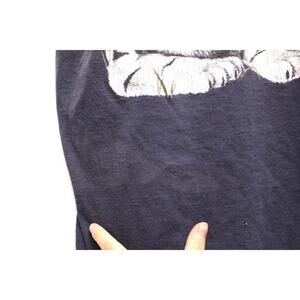 Condition: spots of discoloration on front, normal wear/fading, cracking on graphic, shirt is a faded black or navy blue color