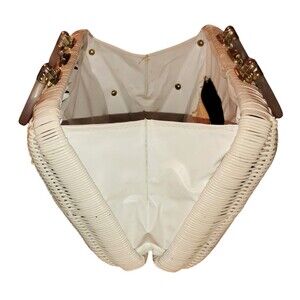 The Vintage White Wicker Purse with Pearl Lucite Handles exudes a classic Mid-Century Modern style, perfect for everyday use. Handcrafted by Lesco Lona in Hong Kong, this original piece features a sleek white wicker design with elegant pearl lucite handles. Ideal for women who appreciate vintage fashion and unique accessories, this purse adds a touch of sophistication and charm to any outfit.
