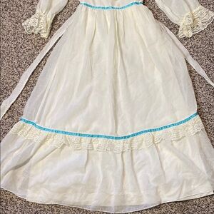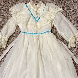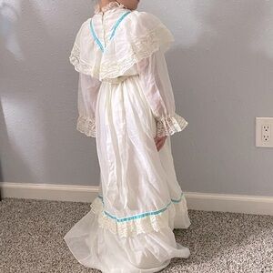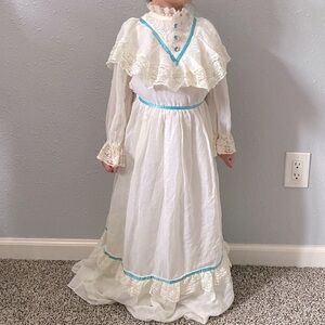 This stunning Vintage gown showcases a ruffled, tiered silhouette in a crisp white with delicate blue accents. The long bishop sleeves and bib collar lend an air of elegance. Lightweight fabric with lace detailing: zipper in back. No size tag, estimated to be 5-7, please refer to measurements. My daughter wears a size 5, it’s a bit long on her. Pit to pit 13.5”. Waist 10”. Shoulder to hem 41”. VGUC, one small spot pictured.