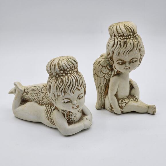 Vintage White and Gold Porcelain Angel Figurines - Cherub Decor Accents - Set/2