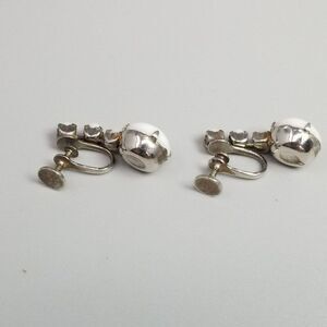 Vintage White Glass Cabochon Dangle Clip On Earrings, Prong Set, Screw Backs
