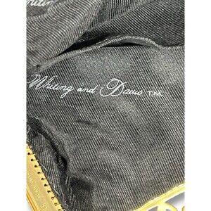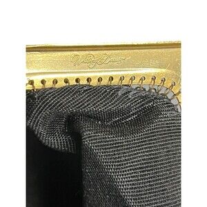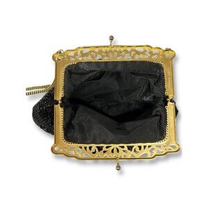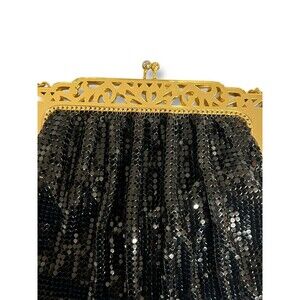This vintage Whiting & Davis shoulder bag is perfect for formal occasions and parties. The black mesh exterior is complemented by gold hardware and a chain strap. The bag features a kiss lock closure and a black fabric lining.