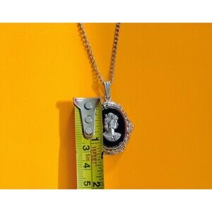 Necklace features a classic silver tone chain with ornate cameo pendant depicting a lady in profile; pendant measures approx. 1.5" tall