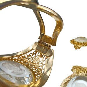 Vintage Whiting & Davis Intaglio Glass Cameo Parure, Gold Filigree Clamper