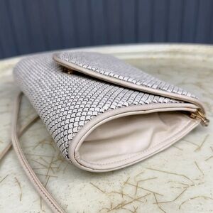 Elegant ivory crossbody bag by Whiting & Davis, featuring a classic mesh design with a satin-lined interior. Ideal for formal events, weddings, or evening outings, adding a vintage touch to your look.