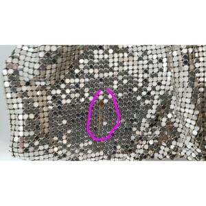 Vintage Whiting Davis Silver Tone Metal Mesh Purse Evening Handbag. Siver-tone metal mesh with a scalloped bottom edge. Art Deco Style with kiss-lock clasp closure and a silver-tone chain handle. Lined with cream color fabric. Designer logo Made in USA tag sewn inside. The lining is intact without stains or rips. There are a couple of metal wear spots and rust spots on the mesh. Some metal wear on the top of purse. Please view photos. Chain handle measures approximately 17". Bag is approximately 6" W x 5.5" H. Please view the photos.