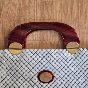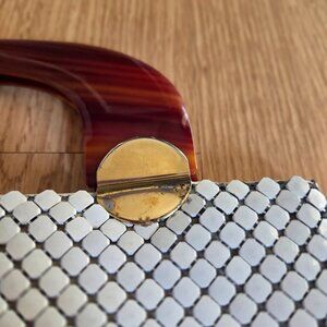 Classic vintage glam โจ This Whiting & Davis mesh tote features white enamel mesh with faux tortoise handles and gold-tone accents. A striking piece from the iconic maker known for their signature mesh handbags.
