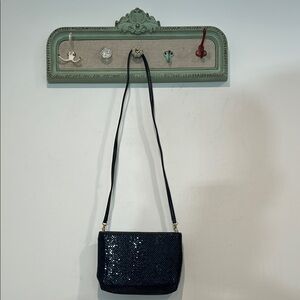 chic accessory featuring a glittery surface that adds a touch of elegance to any outfit. Its compact design and thin shoulder strap make it perfect for evening events or casual outings. The bag's shimmering finish ensures it stands out as a stylish choice for various occasions.