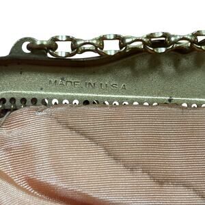 Vintage Whiting & Davis gold mesh evening bag - a flapper style top handle purse that can convert to a clutch when desired. This version has a rhinestone covered flip clasp and shapely goldtone metal frame. Clearly hallmarked on the frame and tagged inside. Sadly, the traditional pink fabric lining shows a water stain on both sides (see pics) - in otherwise excellent condition and certainly ready to carry!