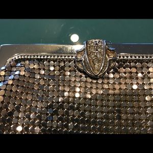 For 140 years, Whiting & Davis has been the toast of Hollywood & society, making mesh handbags the fashionable covet with superior quality and ultimate glamour. Google to see W&D’s all over the red carpet to this day!. This is vintage, circa 1950’s, & aside from the usual wear with age, its gorgeous and classic. Stunning iconic rhinestone clasp. Inside lining threads loose, (pictured) can tack by hand. Short wrist chain can be tucked in to carry as a clutch. A must for any vintage collection!