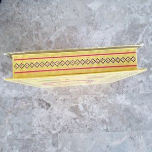 Colourful printed embroidered cross stitch design throughout in yellow, green, blue, pink and brown.