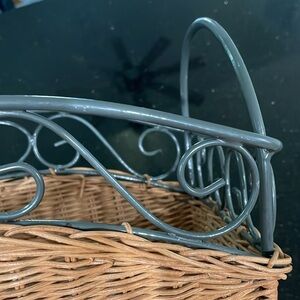 Vintage Wicker And Gray Painted Metal Magazine Rack