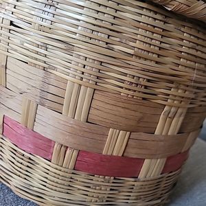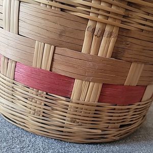 This vintage wicker basket is a beautiful addition to any home decor. Hand woven with care, this large round market basket comes with a handle and lid, making it perfect for floor storage. The natural finish and beige color with red stripe add a touch of elegance to any room.