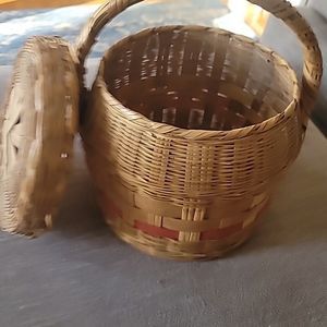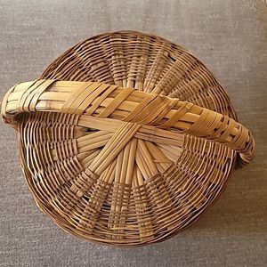 Vintage Wicker Basket Large Hand Woven Round Market Basket Handle Lid 15"hx12"d