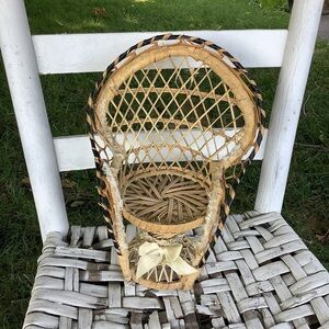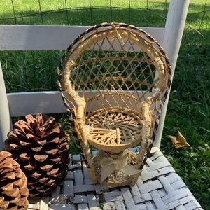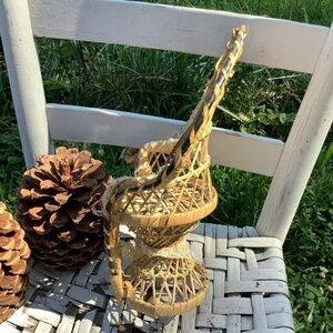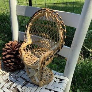 This is a small wicker doll chair that I use for a small potted plant. Perfect rustic bohemian touch for any home! At some point it has been “laced” up, as I call it lol, so there is still some remnants of lace and hot glue that could easily be taken off. But is still cute as it is!