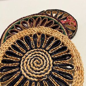 Vintage Wicker Trivets, Set of 3. Brown, red, blue, green round trivets decor