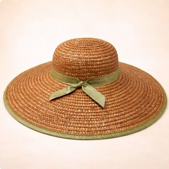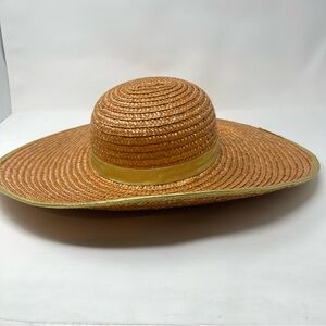 Vintage wide brim straw hat with metallic gold ribbon trim — classic chic sun hat for resort, garden party, and coastal style.