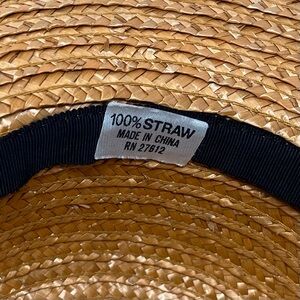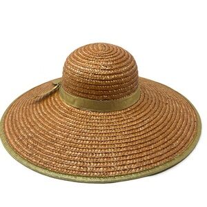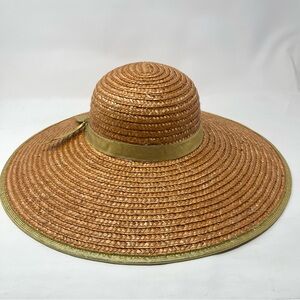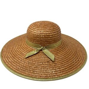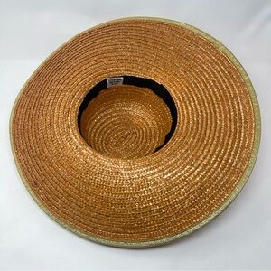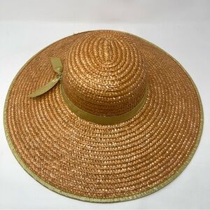 Beautiful woven straw hat featuring a structured crown and wide protective brim. The metallic gold ribbon band and matching edge trim add a refined touch that catches the light without feeling flashy, giving the hat an elevated vintage aesthetic.