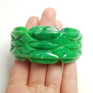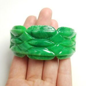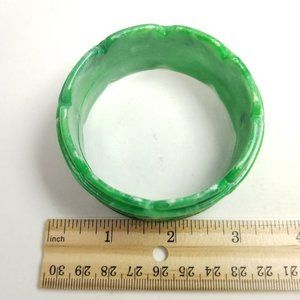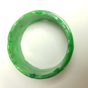 Vintage Wide Green Marbled Plastic Bangle Bracelet, Marquise Shape Design, 70s