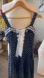 Vintage polka dot jumpsuit with color block trim and bow. Base is a navy blue and has white polka dots. 100% Rayon to give a soft, drapy, cool to the touch feel. Has a back metal zip and the straps are adjustable with buttons for the perfect fit. Best for a size XS to Small.