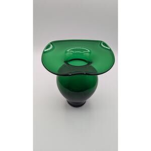 This is a beautiful vintage green glass vase with a wide rim. It stands 7 inches tall and is perfect for displaying flowers or as a decorative piece. The color is a vibrant green. Don't miss out!