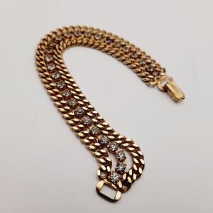 Vintage Wide Three Strand Gold Tone Bracelet - 7 1/4 Inches, Curb Rhinestones