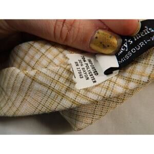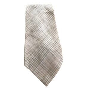 This is a handsome vintage tie in a soft tannish cream color with white, brown, light tan, pink and silver colored stripes in a cross hatched pattern.