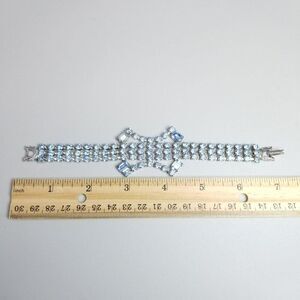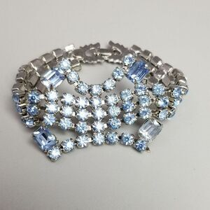 Vintage Wide Light Blue Rhinestone Bangle Bracelet, Glass Prong Set, Silver Tone