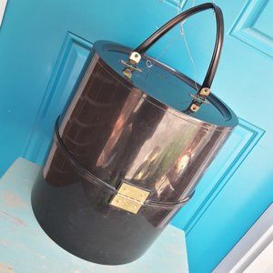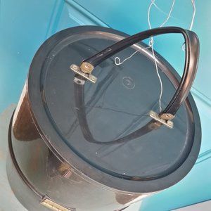 Vintage Wig Box or Hat Box Tall Narrow Suit Case Mod 60s Art Deco Contempo Hard Back plastic with Claspin Lid and Handle on top. Clean and Usable! 2 Side Locks flip up like a briefcase closure. Inside in great conditiin except for a small nip dot on top. Its big and tall! Good condition, clasps work has slight tarnish on brass metal. Great for storage of any items including hats or wigs or clothes or jewelry or anything you dont want crushed.