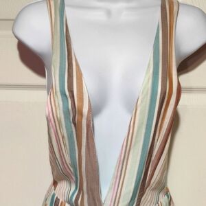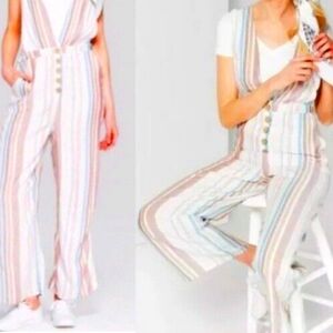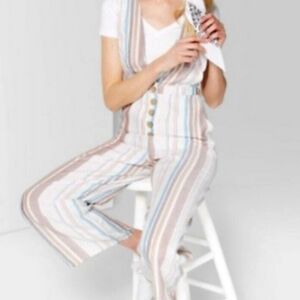 Adorable jumpsuit by Wild Fable vintage made from 100%rayon soft n comfy. deep v neck with adjustable button straps in back that. riss cross. has 2 pockets one on each side wide leg pants with 5 wooden buttons in front from waist down that are usable for easy application. In colors of white with pink tan dk tan brown and teal horizontal stripes. looks great with a t shirt underneath and some white sneakers or sandals. brand new never worn. size small. measurements are approximately lying flat waist 15" inseam 27 to 28". Really adorable 🥰