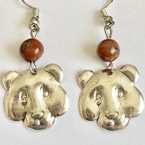 Vintage Wild Grizzly Bear Earrings Carnelian Stone Beads Silver Tone Charms