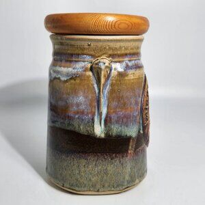 This handcrafted ceramic jar, adorned with a serene loon and Minnesota wild rice motif, evokes the charm of rustic wilderness. The glazed finish and warm wooden lid blend practicality with timeless artistry, making it an ideal collectible or functional storage piece. Its earthy tones and textured design highlight traditional craftsmanship.