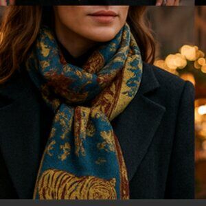 Step into the warmth & artistry of a bygone era with this true vintage wildlife jacquard shawl, featuring beautifully woven scenes of tigers, elephants, birds, and jungle foliage. The reversible design shifts between a stunning slate-blue side and a rich golden ochre tone, framed by deep brick-red borders.Wear long & draped, wrapped once around the neck, or as a full shoulder wrap.