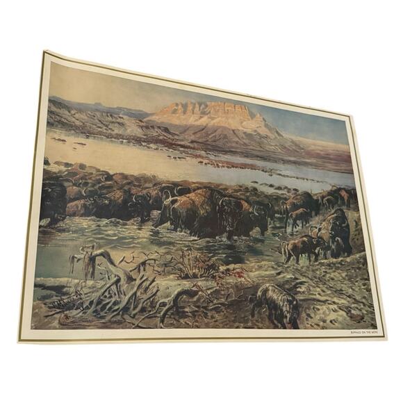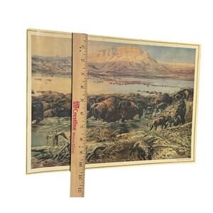 Vintage Wildlife Print Buffalo on the Move Bison Herd Western Americana Art READ