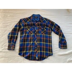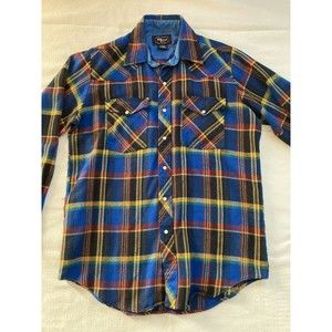 Vintage William's Bay Men's Flannel Shirt Blue Yellow, Red, Pearl Snap Large