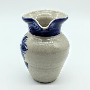 Classic hand-painted salt glazed creamer pitcher from Williamsburg Pottery with blue rim and floral pattern.