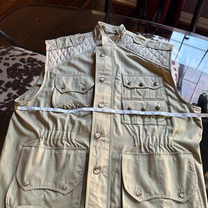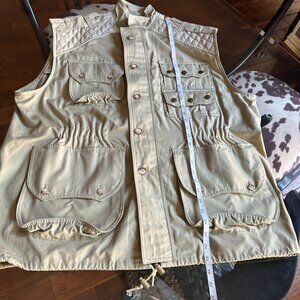 Vintage 90s Willis & Geiger Tan Safari Bush Hunting Field Photography. Men's size XL. Please see measurement pics for fit. 100% cotton. Button and zip front. Drawstring hem. Many pockets. Quilted shoulders. Excellent condition. Like new and likely never worn. Smoke-free home.