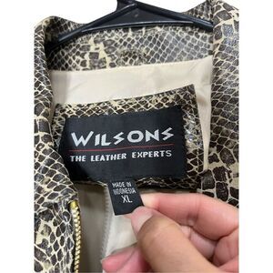 Vintage Wilsons 100% Leather Snake Print Jacket Size XL. Great condition. Zipper in front. Fully lined. The inside lining has a couple stains shown in pics. Classic leather jacket