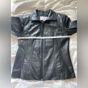 This Wilsons Leather jacket has a sleek, classic design made from black leather. It features a front zip closure, a structured collar, and a form-fitting silhouette with tailored seams that give it a flattering shape. The leather appears smooth with a soft sheen, giving it a polished look suitable for both casual and dressier outfits. It’s from the “Maxima” line, suggesting it may be a women’s style that emphasizes a refined, minimalist aesthetic. A timeless piece that pairs well with jeans or slacks. Some stitching flaws/repairs on the inside lining shown in photos.