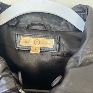 Vintage Wilson’s Leather Basket Weave Woven Leather Jacket Dark Brown. in amazing condition, with the only small flaw being that the one button on the inside could use some reinforcement.